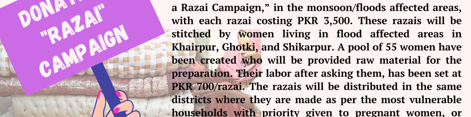 With the fast-approaching winter, Roots for Equity and Pakistan Kissan Mazdoor Tehreek has initiated a “Donate a Razai Campaign,” in the monsoon/floods affected areas, with each razai costing PKR 3,500. These razais will be stitched by women living in flood affected areas in Khairpur, Ghotki, and Shikarpur. A pool of 55 women have been created who will be provided raw material for the preparation. Their labor after asking them, has been set at PKR 700/razai. The razais will be distributed in the same districts where they are made as per the most vulnerable households with priority given to pregnant women, or women with infants, the elderly and or persons with disabilities.